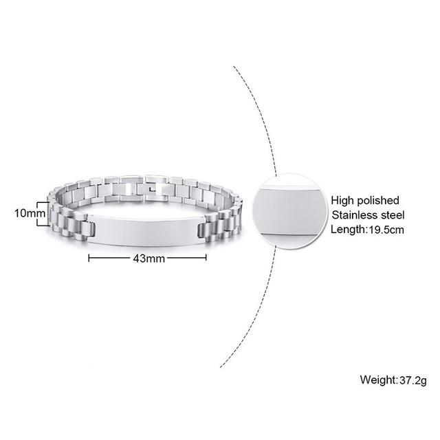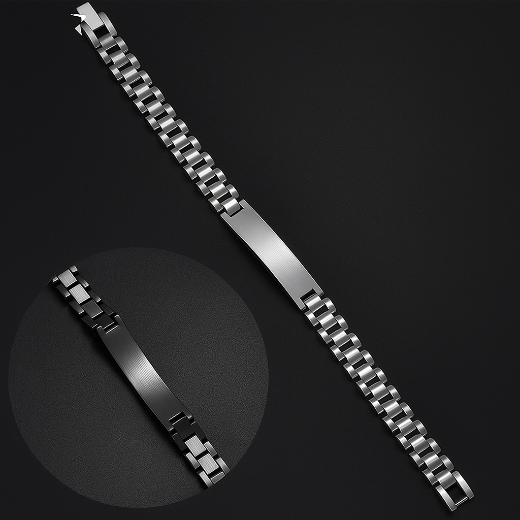 Design: Modern link bracelet with a sleek, minimalist ID plate